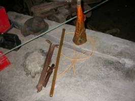 When we were down in the mine, we were shown how they used dynamite to break the slate. In the picture here we have a dynamite carrier, fuse wire and tools to make a hole in the rock. The miners would run for cover once the use was lit. |