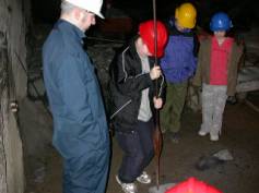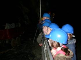 Here is a picture of Tom trying to make a hole in the rock. He is being watched by a real miner who still works at the mine. There are some 40 miners still working here, however a hundred years ago there would have been 800! |