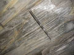 Here is a picture of a hole in the wall where the dynamite was put. As you can see it is at an angle of 90 degrees from the grain if the slate. We think that the people who did this were very brave. |