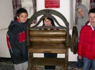 The second picture is of a churn to make butter. The women used to make butter to sell at the market. They would put in the milk and turn it over and over until it made butter. |