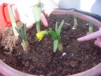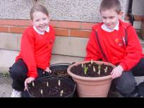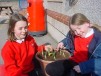 This is a photo of Abi, Amy and Emily planting the daffodil bulbs. The date of the bulb planting is November the 28th.The girls are planting the bulbs into small blue boxes. We will keep them in the warmth and give them water. When they germinate we will plant them outside. |