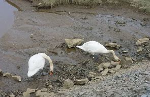 ![]() These are Swans, they came very close. we have three types of Swan in Wales. They are Mute, Bewick and Whooper. The Whooper and Bewick Swans only come in winter. They travel from the arctic. They have yellow beaks. These Swans are Mute Swans, they have orange beaks. |