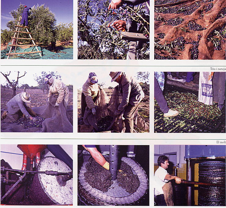 - El banc o escala per a collir les olives més altes. - Les borrasses que s'estenen al voltant de tot l'arbre. - La sarpeta. Eina en forma de mà, mànec de fusta i dits de ferro. - El cabàs. S'hi recullen les olives de les borrasses i es posen als sacs. - El tractor per a transportar les olives. Triar i netejar - El triador. Es separen els terrossos, fulles o branquillons de les olives perquè quedin netes . El molí: al molí es on es fa la part de la feina més laboriosa de tot el procès. - La bàscula on es pesen . - La gronsa. Caixa en forma de piràmide que funciona com un embut deixant caure per l'obertura inferior les olives que s'hi han abocat . - El bisenfí. Porta les olives al trull on seran moltes i convertides en pasta . - El trull. Format per una pedra inferior plana i vàries pedres giratòries unides per un eix . - Les curres o moles van esclafant les olives que el bisenfí ha portat . - La batedora. Una vegada aixafades les olives formen una pasta la qual passa a la batedora que la va remenant de manera constant - La pastera . És el dipòsit on va a parar la pasta. -Els esportins .Cabassos plans que s'apilen en una mena de carretó formant el que s'anomena peu. -La premsa. Una vegada el peu acabat es conduït a la premsa la qual exerceix una pressió que fa brollar l'oli. -Les bassetes. L'oli que va regalimant de la premsa es conduït a les bassetes on es neteja amb aigua i per decantació es separa aquesta de l'oli ja que pesa menys i sura . -Dipòsits o cups. L'oli ja és a punt per a ésser envasat . IMATGES PAS A PAS DEL PROCÉS D'OBTENCIÓ DE L'OLI AL MOLÍ TRADICIONAL |