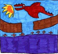 El matí següent, el grup d’en Lluís va anar jugar a la vora del llac. Jugant, jugant es van allunyar i van veure un pontet de fusta que creuava l’extrem del llac. Quan hi passaven per sobre , una bèstia molt grossa va sortir volant de darrera dels arbres i va llençar una gran flamarada que va trencat el pont. Tots van anar a parar a dins del llac.