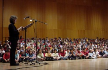 | Cristina Felip del CEIP Pins del Vallès, presenta l'acte | Mireia Blázquez del CEIP Joan Maragall digirint el seu grup | |