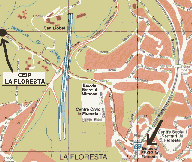 Baixeu a l'estació de La Floresta, haureu de caminar 10 minuts (Plaça Miquel Ros – Carrer Can Llobet –