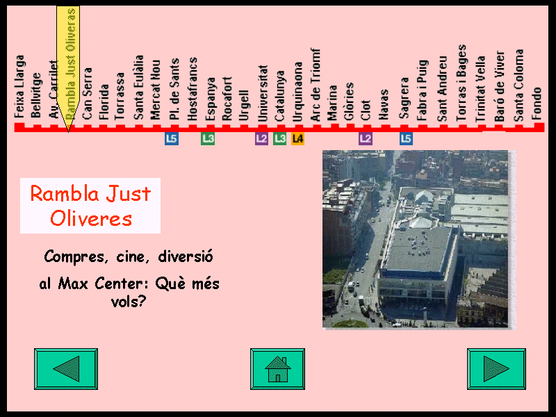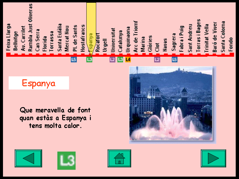 Itineraris en metro Material informàtic que simula la xarxa del metro de Barcelona. L'objectiu del material és exercitar aspectes que potenciïn l'autonomia dels alumnes dels centres d'EE a l'hora de poder planificar sortides, etc. Els continguts són les línies del metro una a una i els itineraris, amb o sense transbordament. El recurs tècnic va ser el programa Power Point creant una presentació per cada línia, on les diapositives són les estacions. Les presentacions enllacen entre si simulant els transbordaments de la xarxa de metro. Cada estació mostra el diagrama de la línia, amb els enllaços, una imatge i un text significatiu de cada estació amb una petita animació. Les imatges de les estacions poden ser fotografies de l'entorn, monuments, equipaments, il·lustracions relacionades amb el nom, etc. Els textos són rodolins o informacions. El joc comença en el vestíbul on hi ha una pantalla de presentació, es pot triar la línia a treballar o passar a una segona pàgina on es pot seleccionar una estació concreta. En seleccionar-ne una s'enllaça amb la presentació de la línia que permet anar endavant o endarrere. Les presentacions de les línies comencen amb un planell general i a continuació les diapositives de les estacions. A cada estació hi ha icones per anar a l'estació següent, a l'anterior i a la pantalla principal. En les estacions on hi ha enllaç apareixen icones de les línies que en fer clic porten a l'altra línia. El treball educatiu pot consistir en fer una exploració sistemàtica de les estacions o bé realitzar viatges virtuals per anar d'un lloc a un altre. El material és obert i les estacions es poden personalitzar de manera que les informacions siguin significatives per als alumnes. Per exemple, a la parada de l'escola, de casa seva o de casa els avis es poden posar fotos, textos o missatges de veu adequats. Aquests materials es molt voluminòs i tembé estarà disponible al Sinera Materials de Formació 2001 |