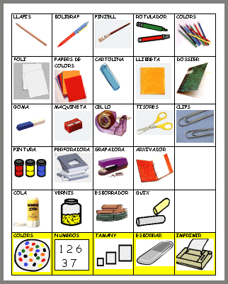 El plafó del calendari és un document amb les estacions i el mesos representats per una icona significativa. Les caselles dels dies estan buits perquè es puguin personalitzar anualment. En aquest calendari s’hi poden situar les fotos dels alumnes i professors per indicar els aniversaris, o altres imatges per indicar esdeveniments socials d’interès. El plafó de menjars és un instrument pensat per a la comunicació en activitats alimentàries, ja sigui en situacions reals o simulades. Naturalment, el plafó no incorpora tots els aliments i potser caldrà modificar-lo incorporant uns aliments i suprimint-ne d’altres. El plafó de materials permet demanar els diferents materials escolars i d’oficina. Els objectes estan representats amb fotografies reals o icones. Existeix una versió en Tpwin que permet escriure llistes, preparar comandes... Iniciació a la lectorescriptura per a joves analfabets o estrangersLa finalitat d’aquest taller era preparar materials i activitats d’aprenentatge de la lecto-escriptura adreçat a joves i adolescents. L’activitat del taller es va orientar a produir tres tipus de materials:
