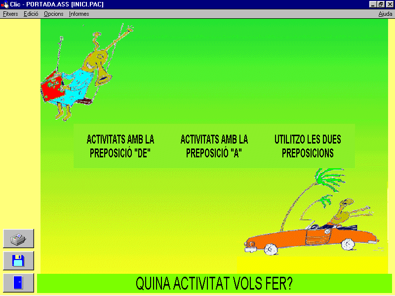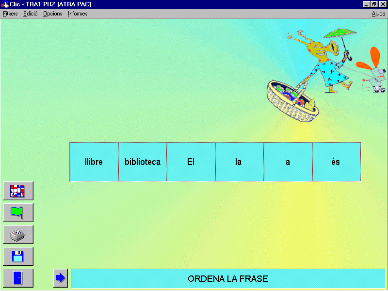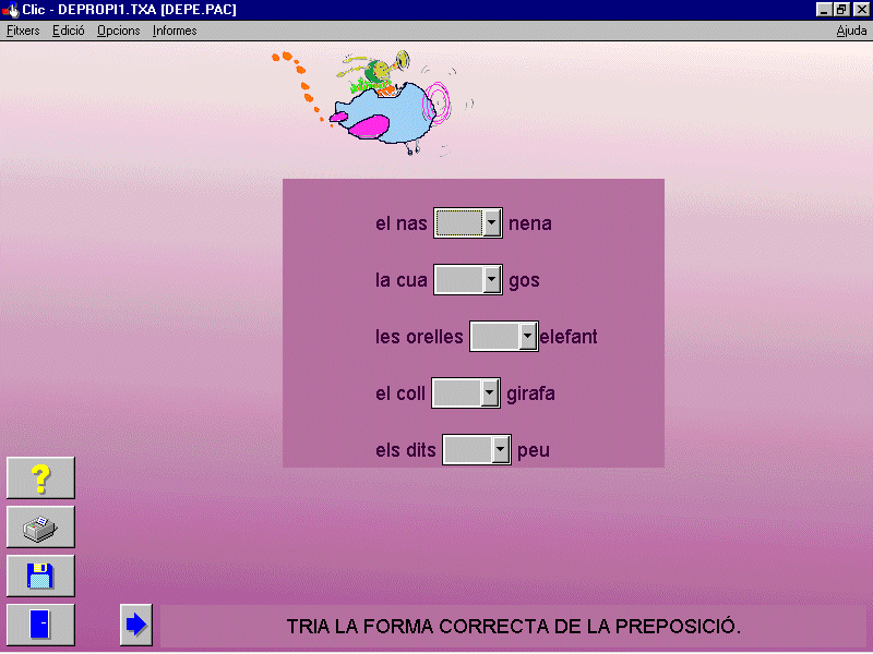 L'estructura de les frases i les preposicionsAquest grup es va proposar preparar activitats per treballar les preposicions utilitzant el programa Clic, adreçant-se a persones amb deficiències auditives. Aquest tipus de població troba una especial dificultat en l’aprenentatge de les preposicions, graduant-se els exercicis en taques de complexitat creixent. En una jornada van finalitzar 64 activitats per a treballar les preposicions a i de en diferents estructures lingüístiques.