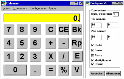 El programa preveu cinc tipus d'operacions o exercicis bàsics: numeració, sumes, restes, multiplicacions i divisions. Utilitzant el menú Fitxers les configuracions es poden guardar i recuperar en fitxers externs que tindran l'extensió CAL. |