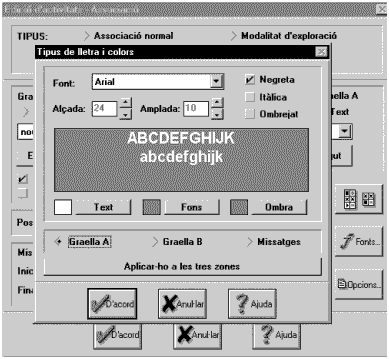 Aquests atributs poden ser diferents per a cada una de les tres zones: Graella A, Graella B i caixa de missatges, però el botó Aplicar-ho a les tres zones copiarà els atributs de lletra i color de la zona actual a les altres dues.