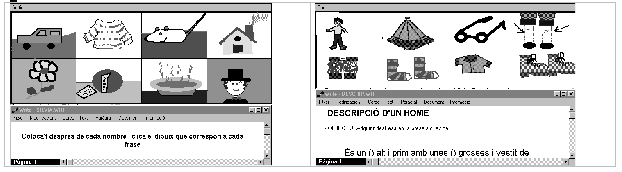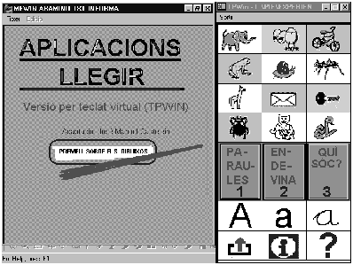 Tpwin és un programa encara en evolució, on noves versions milloren i corregeixen els errors de versions anteriors. Tpwin és una aplicació de 16 bits que pateix d'importants limitacions quan funciona en entorns de 32 bits. El programa s'engega correctament en tots els entorns Windows, ja sigui el Windows 95, Windows 98 o Windows NT però només dialoga amb aplicacions de 16 bits. Per aquesta raó les adaptacions utilitzen el Write, el Paintbrush o l'Ami Pro en les versions del Windows 3.x en lloc de les versions més actualitzades. Durant el darrer curs alguns professionals hi han estat treballant i fruit d'aquest interès són els materials que avui es distribueixen. S'ha d'agrair especialment l'esforç del Sr. Jordi Escoin i dels seus alumnes de la Universitat de Vic, que han generat nombroses aplicacions. Cara És una adaptació pensada per dibuixar cares. Les seves autores, l'Agnès Marí i la Sílvia Batllori, estudiants de magisteri de la Universitat de Vic, van preparar aquests materials dins una unitat de programació per treballar el còmic amb alumnes que tinguin problemes motrius. L'adaptació funciona amb el Paintbrush, que a l'engegar-se carrega la imatge d'una cara en blanc. A la caràtula hi ha els diferents elements de la cara: boca, celles i ulls, en variades situacions expressives. L'activitat consisteix en dibuixar una cara enganxant els diferents elements. El dibuix es pot pintar, imprimir i desar utilitzant les opcions de menú del Paintbrush. ![]() Descripcions Descripcions són dues activitats d'escriure, desenvolupades també per alumnes de magisteri de la universitat de Vic, l'Anna Julià, la Roser Carreras, la Sílvia Batllori i l'Agnès Marí. A l'engegar-se l'adaptació s'obre el programa Write amb un text que cal completar amb les paraules/dibuixos a la caràtula. Els alumnes, amb el ratolí, han d' assenyalar el buits del text, representats per parèntesis (), clicar els dibuixos de la caràtula i d'aquesta manera completar el text. Les opcions del programa Write estan operatives i activant-les podem imprimir, desar o modificar el text. No és difícil modificar el contingut del vocabulari de l'exercici, com diuen les seves autores en el propi text, l'objectiu és adquirir destresa en la precisió lèxica. ![]() Aplicacions llegir Són un conjunt d'activitats de lectura desenvolupades per la Tauleta sensible i adaptades al Tpwin pel Sr. Manuel Casteleiro (jcastele@pie.xtec.es), un company mestre d'educació especial del CEIP La Floresta de Sant Cugat. Aquesta versió segueix la mateixa pauta que les aplicacions tauleta però el seu autor ha introduït algunes millores, com són: