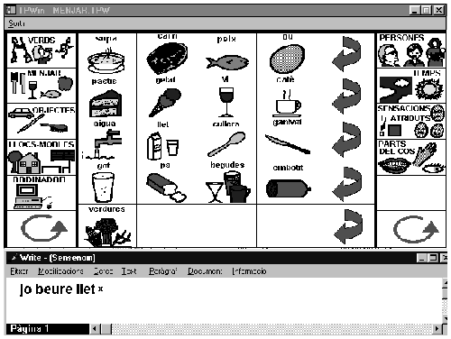 L'adaptació funciona raonablement bé amb el mètode d'escaneig automàtic i es poden canviar els continguts dels exercicis modificant el fitxers .TXT sempre que se'n respecti la seva estructura. ![]() Plafons És una adaptació per a la comunicació alternativa utilitzant els símbols SPC que van desenvolupar alumnes de psicopedagogia de la universitat de Vic. L'adaptació es compon d'un conjunt de plafons, enllaçats entre si, que escriuen missatges en un processador de text. Si establíssim la relació adequada amb programa de síntesi de veu el sistema podria emetre missatges parlats. El sistema està pensat per accedir-hi mitjançant l'escaneig automàtic. En tots els nivells d'exploració hi ha una icona que permet tornar al nivell superior. En engegar l'adaptació a la part superior de la pantalla apareix una plafó i a l'inferior una finestra per escriure. Tots els plafons tenen una estructura semblant: