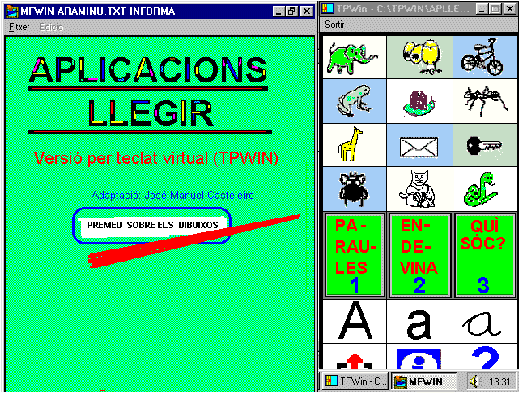 Introducció El Tpwin, Teclat en Pantalla per a Windows, és un teclat virtual pensat per facilitar l’ús de l’ordinador a persones inexpertes o que requereixen una accessibilitat adaptada. El sistema genera diferents configuracions, fitxers TPW, que es poden encadenar unes amb d’altres. El programa actua com un teclat que envia ordres a un programa de Windows. Cada configuració és una adaptació de la interfície d’usuari dels programes i cal planificar-la en funció dels usuaris. Aquestes configuracions poden simplificar les opcions de l’entorn, fer-les més accessibles o proporcionar els recursos necessaris per a una activitat educativa concreta. El Tpwin funciona en tots els entorns Windows, fins i tot el Windows 98, però en l’actual versió solament es pot utilitzar amb aplicacions de 16 bits, és a dir, les pròpies del Windows 3.x. ![]() La nova versió El Tpwin ja va ser distribuït amb el Sinera 98 però aquesta nova versió, tot i ser compatible amb l’anterior, incorpora novetats que faciliten la seva utilització. Les més destacades són: