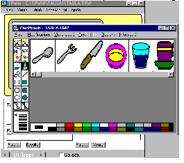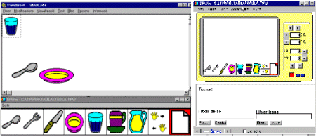 Una primera aproximació: l'aplicació Taula Taula és una aplicació de Tpwin que treballa amb el Paintbrush i que mitjançant els dibuixos de plats i coberts, permet simular l’activitat de parar taula. Un cop instal·lada la nova versió del Tpwin aquesta aplicació s’activa clicant una icona. La pantalla queda dividida en dues parts, a la superior s’engega automàticament el Paintbrush i a l’inferior se situa un plafó d’icones amb els dibuixos d’una vaixella. Clicant en els dibuixos aquests s’enganxen en el Paintbrush com un retall. Caldrà clicar-los i arrossegar-los fins a situar-los al seu lloc. De vegades el sistema presenta una certa inèrcia i no respon a la primera. ![]() Per sortir de l’aplicació cal clicar el menú Sortir del Tpwin. El Paintbrush es tanca automàticament tot preguntant si es vol desar el dibuix. El Tpwin es redimensiona i mostra el disseny de l’aplicació. Creació de noves aplicacions Abans de crear una aplicació és important fer una planificació que tingui en compte l’activitat que es vol realitzar, el nivell dels alumnes i el sistema d’accessibilitat. Per a començar el més fàcil és treballar amb una activitat d'escriptura adreçada a alumnes que ja llegeixen i que utilitzaran el ratolí. 1r Dades globals de l’aplicació Per crear una aplicació s'activa el menú Fitxer opció Nou. En el quadre de diàleg que es visualitza s’especifiquen les dades generals de l’aplicació. Les fonamentals són: