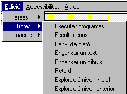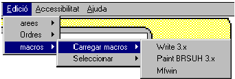 ![]() Aquestes ordres estan declarades en el fitxer MACROS.INI que actualment conté macros del Paintbrush, el Write i l’Mfwin. Per carregar una llibreria de macros primer cal clicar l’opció de Carregar i seleccionar un programa. Automàticament el menú Macros incorpora la llista de les macros disponibles. En seleccionar-ne una s'actualitzen les dades de les caselles text, icona i so amb els valors declarats a la llibreria. 3r La caràtula El procés de creació finalitza construint la caràtula d’un fitxer gràfic que serveix a l’usuari per identificar les diferents funcions de l'aplicació. El menú Fitxers, opció Caràtula, activa un sistema de creació automàtica de caràtules. Aquest menú inclou dues opcions: