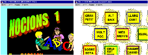 Introducció Mestres i professionals de les escoles d’educació especial del Gironès ens han fet arribar un conjunt de paquets Clic que treballen el càlcul, la lògica i altres nocions bàsiques a nivells molt bàsics. La persona de contacte i autor de bona part dels materials és en Pere Bassachs, pbassach@pie.xtec.es, i us hi podeu adreçar per a qualsevol suggeriment. NOCIONS I El Nocions 1 és un conjunt d'activitats Clic destinades al treball de conceptes molt bàsics que els qui treballem amb alumnes amb NEE sovint ens adonem que els costa molt d'assolir. Fins i tot alumnes d'edat molt avançada tenen dificultat en distingir i aplicar correctament el concepte adequat. Sovint empren el concepte oposat, caient en errors i confusions. Només una pràctica molt sistemàtica, repetitiva i, sobretot, ben dirigida per part del professional, pot ajudar a superar aquestes confusions. El material consta de 224 activitats agrupades en 13 paquets accessibles a través d’una pantalla de menú. ![]() Aquesta primera part d'activitats Clic pretén: