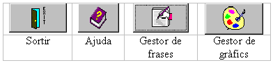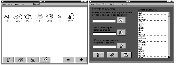 Com escriure una frase En engegar el programa la primera pantalla presenta quatre icones, ![]() Activant el Gestor gràfic s'accedeix al diccionari on es pot observar el tipus de vocabulari que incorpora i reconeix el programa: la forma dels noms, els nexes, els temps dels verbs, etc. En tancar, el programa sempre pregunta si es volen guardar la modificacions dels gràfics o del diccionari per a properes sessions. Activant el Gestor de frases apareix un formulari en blanc per escriure. Hi ha la zona de Títol que no es traduirà, i, una zona de Text on es pot escriure un text de com màxim 640 paraules i sense signes de puntuació. El text ha d'estar escrit en termes incorporats en el vocabulari, en el cas del llenguatge signat es pot escriure "el pare rentar amb aigua i sabo". En el Gestor de frases el menú Edició permet retallar i enganxar. El menú Gestor permet importar un text i la icona esborra el text de la pantalla.Clicant la icona s'accedeix a una nova pàgina on el text està escrit amb lletres i alhora està traduït en signes.Clicant la icona es pot retornar al Gestor de frases per rectificar les icones. El text escrit es pot modificar per millorar-ne el redactat. En el cas de l'exemple es pot rescriure la paraula "rentar" per "es renta". Un cop les icones i el text siguin correctes es pot imprimir aquesta pantalla clicant la icona Impressora. El diccionari El mòdul Gestor de gràfics permet gestionar el diccionari afegint i eliminant paraules del vocabulari. El vocabulari es compon de paraules associades a dibuixos. Les paraules són entrades úniques i no poden estar repetides. Els dibuixos han de ser fitxers en format BMP de 75 x75 píxels. El vocabulari implementat en el diccionari apareix en forma de llista de paraules que no estan ordenades alfabèticament si no per ordre històric, amb les paraules més recents al final de la llista. El Gestor gràfic utilitza aquest sistema d'icones per activar les diferents funcions. ![]() Per incorporar una nova paraula al diccionari: