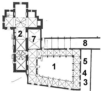 L’espai central d’un monestir és el claustre, a l’entorn del qual es poden trobar l’església, la cuina, el refetor, el calefactor, la biblioteca, la sala capitular, els dormitoris, el locutori o el celler.