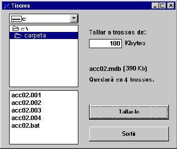 la capacitat de la seva bústia. Serveix per a qualsevol tipus de fitxer (PCC, EXE, WAV...) i el seu funcionament és molt senzill. Seleccioneu el fitxer que voleu tallar a trossos i indiqueu-ne la mida. El programa generarà un seguit de fitxers amb extensió 001, 002, 003, etc. i un fitxer BAT, que serveix per tornar a enganxar les peces quan hagueu de reconstruir el fitxer original. Un cop enganxades les peces ja es poden esborrar tots els trossos (001, 002...) i també el fitxer BAT. |