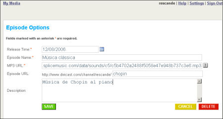 Posem nom a la producció. Com hem dit abans, aprofitem un MP3 en URL que havíem creat a l'Splicemusic de la pràctica anterior i el col·loquem a "MP3 URL". Completem els camps i desem amb "Save".