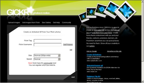 El Gickr converteix en una petita seqüència un grup de fins a 10 imatges portades des del Flickr o pujades des del nostre ordinador. És en línia i el trobem a http://gickr.com/, no ens demana susbscripció.