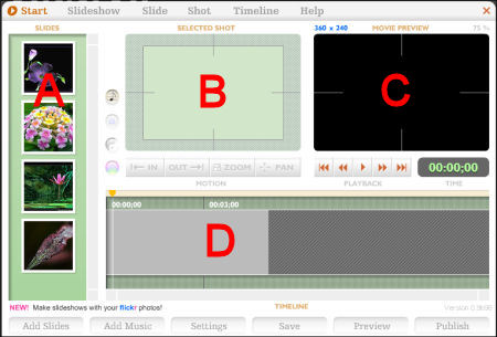 I ja ens trobem a la superfície de treball on trobem les fotos que hem carregat (A), l'espai de manipulació (B), la pantalla de previsualització (C) i la línia de temps (D). |