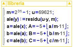 Podríeu tancar la lliberia i tindríeu ben bé el que es proposava al principi. Però, tanmateix, tots els altres problemes de canvi en el valor dels nombres aleatoris es mantenen. Tot seguit presentem una llibreria que, entrant un nombre enter, dit llavor, permet generar nombres aleatoris que en cada recàlcul siguin els mateixos... fins que canvieu la llavor! Hom pensarà que per a un problema senzill com l'anterior això és com "matar mosques a canonades", però tingueu ben present que del que es tracta és de donar idees per a les vostres aplicacions didàctiques. I, molt concretament, si voleu generar un gràfic intercatiu que inicialment tingui unes components aleatòries (però que el gràfic es mantingui en tota la interacció), llavors aquesta llibreria us pot servir! |