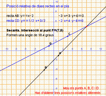 WIRIS: b5_rectes_secant1.html Contingut: Intersecció de dues rectes secants Dades: Dos punts de cada recta Interactivitat: El punts A, B, C i D S’actualitzen les rectes, les equacions i dóna el punt intersecció . Si les rectes són paral·leles o coincidents, informa que no són rectes secants.