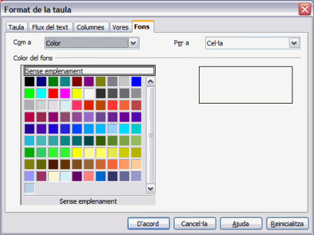 el disseny de la pàgina amb la icona Visualització prèvia de la pàgina Ara només us caldrà omplir els espais amb dibuixos o text. Pot ser útil, també, remarcar les cel·les amb diferents colors. Això ho aconseguireu fent clic amb el botó dret del ratolí un cop situats dins la cel·la que vulgueu remarcar. Trieu l'opció del menú contextual Taula | Propietats de la taula . A la pestanya Fons, podeu triar el color que voleu donar a la cel·la. A la dreta del menú, podeu veure reflectits en una vista prèvia com afecten els canvis. Recordeu de triar a Per a: l'opció Cel·la si només voleu fer incidència a la cel·la on heu situat el cursor.