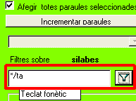 | És l'apartat més important de cara a seleccionar paraules. Des d'aquí podem triar el tipus d'informació que utilitzarem per seleccionar les paraules (nombre se síl·labes, nombre de lletres, categoria semàntica...). Segons quina escollim s'activarà el desplegable inferior ( amb valors relacionats al tipus d'informació escollida) o el camp de text per filtrar (on introduirem criteris de cerca de forma manual). | |||||||