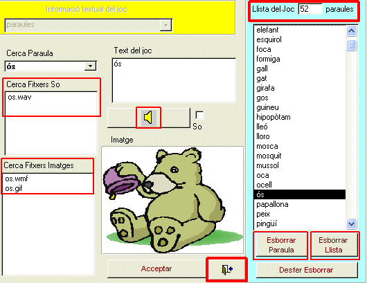 Amb les paraules seleccionades prepara automàticament unes activitats amb cadascun dels programes. En el moment de crear-les dóna informació d'on desa els fitxers que genera (a quina carpeta els desa). Si no tenim marcada l'opció Crear nova activitat, cada vegada que genera una activitat ho fa sobre l'anterior, la qual desapareix. Això ho fa a causa del gran espai que ocupen aquestes activitats. Però si volem que sempre les conservi, cal marcar aquesta opció. És recomanable que si interessa una activitat creada la copiem en una carpeta diferent o en un CD. |