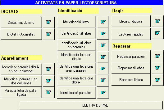 Exercicis en paper en els quals l'alumnat ha d'escriure, copiar, enganxar, etc. Es tracta d'activitats que habitualment fan els i les alumnes, però que ara es poden preparar a mida. El seu funcionament és semblant als Jocs de Llengua però amb propostes i finalitats diferents: identificar (sons, lletres, síl·labes, paraules), repassar (lletres, síl·labes, paraules), confegir paraules (dictats muts, armari codificat...), jocs (cartronets petits de lectura, daus, dòminos, cartes, memory...), etc. |