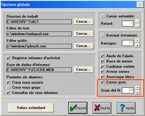 El Clic ens permet canviar el cursor i que aparegui més gran així com el gruix del fil que serveix per poder enllaçar els objectes que pertanyen a l'activitat. Aneu a Cursor gran i verifiqueu.