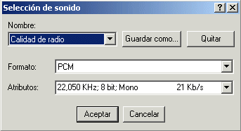 Amb aquests atributs d’enregistrament, 1 minut ocupa aproximadament 1.300 kb. Si useu els valors de CD 44.100 Hz, 16 bits i estèreo, 1 minut ocupa 10 Mb. Si voleu aconseguir una qualitat mitjana, podeu fer servir aquests valors: