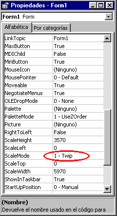 Per defecte Visual Basic treballa en twips, però es pot canviar modificant la propietat Scale mode
