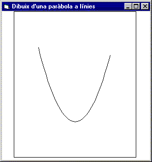 Si voleu que la paràbola es dibuixi en un traç heu d'unir els punts anteriors per tal de fer una línia continua. El procediment anterior l'heu de modificar de la forma següent: ![]() Dibuix de la paràbola amb traç continu: Sub picDibuix_Click ()