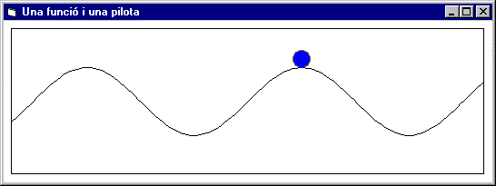 2. Esperar un cert temps depenent de la velocitat amb què voleu que es mogui la pilota. 3. Dibuixar la imatge en la nova posició. ![]() Aquest projecte el desareu a C:\VBCurs\VBActivi\m6\p6 amb el nom m6p6. Fareu un formulari com el de la figura. En ell definireu un procediment que anomenareu DibuixaFuncioSinus de manera que en carregar el formulari s'executin les instruccions PosaEscala i DibuixaFuncioSinus. Aquesta funció dibuixarà una línia a sobre de la qual rodarà la pilota. Fase de disseny de la interfície d’usuariEls objectes que intervenen en aquesta activitat, com a les anteriors, són: el formulari principal (frmAnima) amb valor "Una funció i una pilota" per a la propietat Caption i el quadre de dibuix (picDibuix).Fase de programació de respostes a eventsAfegiu les variables definides a l'activitat anterior, els procediments PosaEscala i Form_Load. Aquest últim canvia una mica el seu codi:Sub Form_Load PosaEscala DibuixaFuncioSinus End Sub El procediment DibuixaFuncioSinus està definit a continuació. Procediments d'àmbit tot el formulari Procediment que dibuixa la funció Sinus: Sub DibuixaFuncioSinus ()