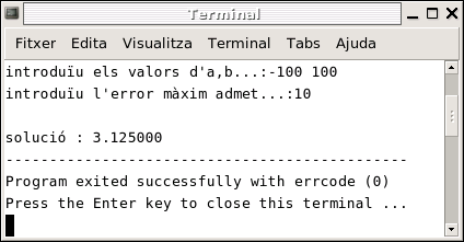 Explicació del programa En aquest cas s'ha implementat el mètode de la bisecció per trobar solucions de l'equació: x3 - 5x - 2 = 0 Aquesta equació es pot expressar com f(x)=0, on f(x) és el primer membre de l'equació. Aquesta funció matemàtica correspon justament a la funció funcio() del programa anterior. El programa demana com dades inicials els extrems de l'interval inicial i l'error màxim que es vol admetre. El càlcul es fa a través de la funció bisecció(). Aquesta funció comença comprovant si els propis extrems de l'interval satisfan l'equació o bé si la funció no pren signes diferents en aquests extrems. Si no és així va dividint l'interval en dos fins que b-a, la mida de l'interval, sigui inferior a l'error preestablert. Quant passa això últim, la funció torna com valor de retorn el punt mig de l'interval. En el cas de la funció de l'exemple hi ha tres arrels. La gràfica de la funció f(x) és: