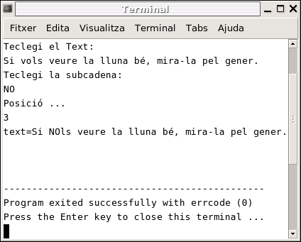 Explicació del programa En aquest programa s'implementa la funció reempl que té el protocol: char *reempl(char *text, char *subcadena,int n) És, per tant, una funció que retorna una cadena (la mateixa cadena text) i reemplaça caràcters de la cadena text per la cadena subcadena a partir de la posició n. Per exemple: si text conté la cadena "Això és una prova" i subcadena conté "dos". La funció reempl(text,subcadena,8) canviarà el contingut de text per: "Això és dos prova".