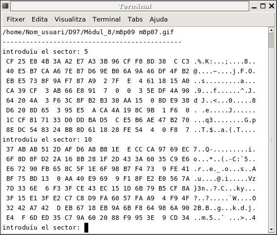 S'obre l'arxiu especificat en mode de lectura i binari (rb) i demana a l'usuari la introducció d'un sector. La cerca d'aquest sector en l'arxiu es fa amb la funció fseek():