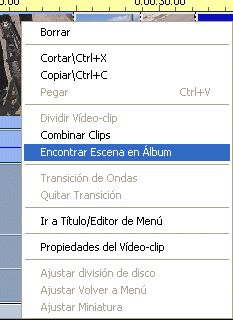 Aleshores, a la finestra de vídeo apareix seleccionada de color blau l'escena que cercàveu. Localitzar escenes de la finestra de vídeo a l'àlbum Si, en canvi, necessiteu saber en quin lloc de l'àlbum es troba una escena que hàgiu inserit a la finestra de vídeo, premeu el botó dret del ratolí damunt de l'escena a la finestra de vídeo i seleccioneu l'opció Buscar escena en álbum: