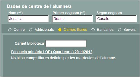 Permet consultat les dades dels camps lliures creats pel centre per gestionar dades d'interés pel centre. Recordeu el centre pot definir camps lliures per la matrícula de l'alumne a partir de menú Sistema > Configuració > Dades lliures. |