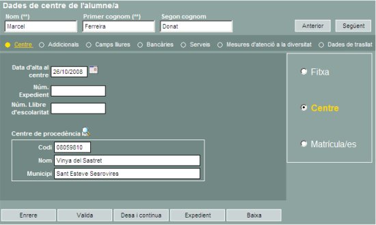 | Permet informar al programa de la data de incorporació al centre, així com de les dades del centre origen | ||