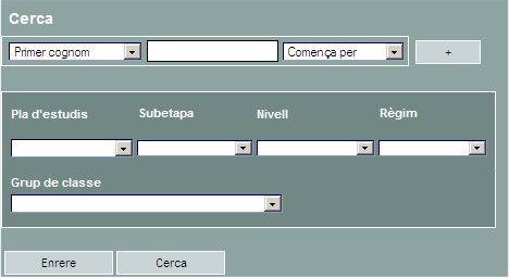 A la part inferior de la pantalla hi ha un botó Cerca que us permet localitzar directament a un alumne o a un conjunt d' alumnes en funció de les condicions del filtre de la cerca. Podeu cercar a un alumne, pel 1r i/o 2n cognom i/o pel nom. O bé els alumnes els alumnes d'un pla d'estudis, o grup |