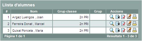 | Si feu la cerca d'un grup d'alumnes a la pantalla principals sols veureu els alumnes corresponents a la cerca realitzada fins a realitzar una nova cerca o activar de nou la pestanya del menú | ||