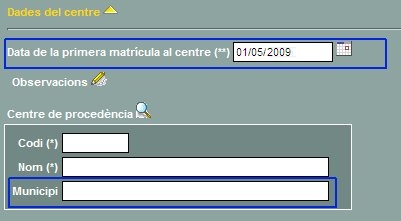 | S'ha canviat el text "Data d'alta" per Data de la primera matrícula al centre. | |