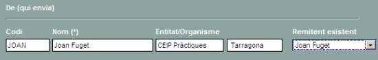 Si el remitent ha estat enregistrat com a contacte de remitents, només cal introduir el Codi, o bé cercar-lo dins la llista del camp Remitent existent i la resta de dades s'emplenaran automàticament. Si el remitent no està introduït a la llista de contactes, es poden emplenar els camps en el moment d'enregistrar el document. Aquestes dates no s'inclouran dins del registre general de Remntents. |