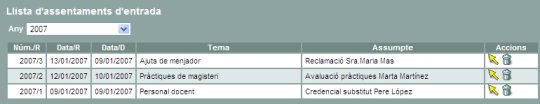 Els documents, un cop enregistrats, es mostren en una graella ordenada per número d'assentament de forma decreixent. Aquesta graella presenta una mínima informació de cada document i, al final de cada filera, les corresponents icones d'acció. |