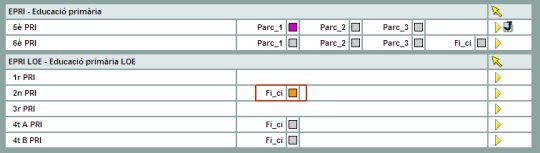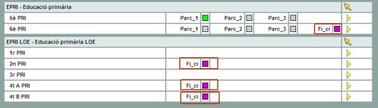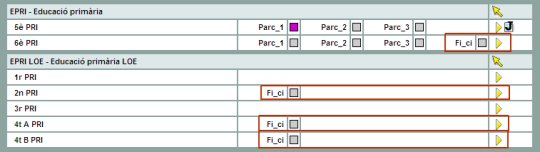 Quan les avaluacions estan definides cal posar en procés d'activació l'avaluació final de cicle, clicant la icona de la dreta de la filera de cada grup de 2n, 4t i 6è. |